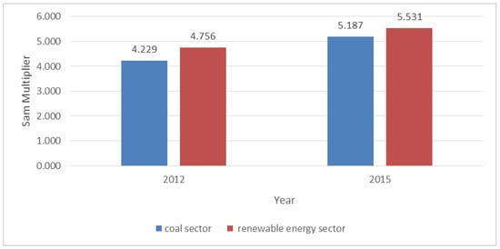 As shown in Figure 4, the SAM multiplier of the renewable energy sector was 5.531 in 2015. It indicates that one unit of investment increase of renewable energy can lead to 5.531 units increase in overall economy, which increased by 16.31% compared with 2012. This shows that the effects of renewable energy on overall economy were increasing. The SAM multiplier of the coal sector was 5.187 in 2015, which increased by 22.65% compared with 2012, indicating an enhanced influence of coal energy on overall economy as well. Note that the SAM multiplier of the coal sector in these two years (2012 and 2015) was lower than that of the renewable energy sector. It shows the effects of traditional coal sector on the economy were weaker than those of the renewable energy sector. These results are not only in line with our expectations but also similar to other studies. For example, Tiwarii find coal consumption growth has a negative impact on GDP, while renewable energy consumption growth has a positive impact on the economy based on a data analysis of 16 European and Eurasian countries []. Ozturk and Bilgili onducted a survey across 51 African countries, finding that a 1% increase in biomass would increase GDP by 0.82% []. Chien and Hu believe that increasing the use of renewable energy can improve economic and technological efficiency, while increasing the input of traditional energy will reduce economic and technological efficiency [].