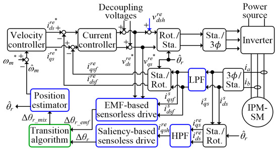 Figure 1 displays the block diagram of the control system. The saliency-based sensorless algorithm estimates the rotor position at zero speed and low speeds through high-frequency (HF) square-wave voltage injection, whereas the back-EMF-based sensorless algorithm estimates the rotor position at intermediate and high speeds. A transition procedure merges the results to estimate the rotor position when the motor is operating in the transition speed region. These aforementioned algorithms are briefly explained in this section.