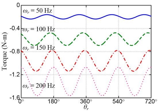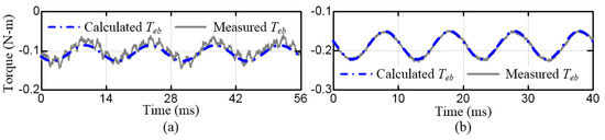 Figure 12a,b illustrates a comparison of the measured and calculated braking torques at 1080 and 1500 rpm, respectively. The braking torque was measured using a torque sensor. The frequency of the torque ripple was twice the rotor speed. Moreover, when HF components were ignored, the measured torque was highly consistent with the values calculated using (18).