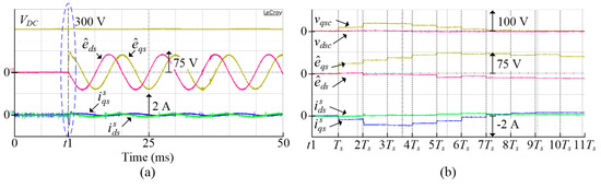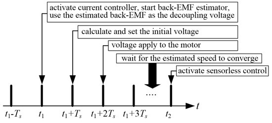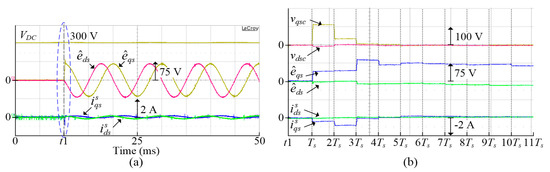 Figure 13 presents the current responses when the back-EMF was decoupled and the initial controller voltage was set to zero. The motor speed was regulated at 3000 rpm by the load motor, and the current commands were set to zero. The drive was activated with the proposed restarting strategy at