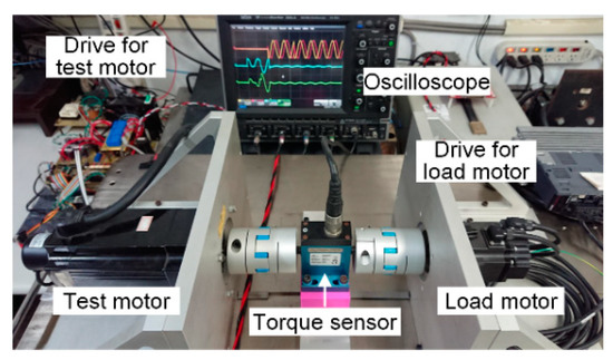Ts = 56 µs) and 2.2 kHz, respectively. The bandwidths of the current and velocity controller were tuned to 1000 and 25 Hz, respectively. The DC-link voltage was 300 V. The transition speed for the saliency-based and back-EMF-based sensorless control algorithm was 600–900 rpm. A load motor provided external load to the test motor. The actual rotor position and speed were monitored by an encoder with a resolution of 2500 pulse/rev.