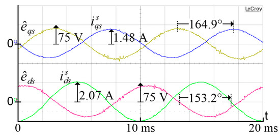 Figure 11 depicts the measured steady-state currents and estimated back-EMF when the current controllers were activated without speed or position feedback. No decoupling voltage was applied. Both the current commands were set to zero, and the motor speed was regulated at 3000 rpm by the load motor. Significant induced currents existed due to the undecoupled back-EMF. The motor currents at various speeds were measured and compared with the calculated values obtained using (14) and (15). The calculated and measured results are summarized in