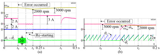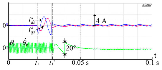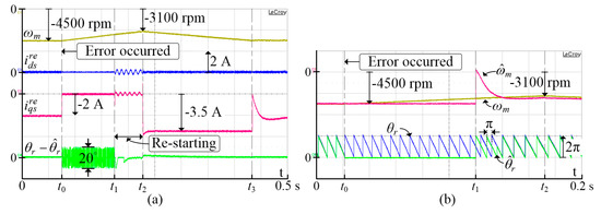 t2 should be higher than 0.02 s for a smooth restart of the sensorless control. Most importantly, although the position estimator takes longer time to estimate the actual speed correctly, the induced current is still suppressed effectively because the back-EMF can be estimated accurately without the speed feedback. Actually, this is one of the key features of the proposed restarting strategy. Note also that for a negative speed, a 180° phase error appeared in the estimated position due to the normalization of Δ
