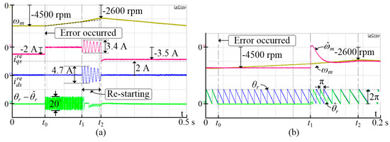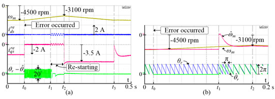 Figure 18 illustrate the results obtained when the motor was running at −4500 rpm with the rated load and then restarted from an unexpected error at