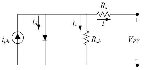 Equations (1)–(6) represent the mathematical model of a PV module. The parameters i, iph, id, and ir are output current, photon current, diode current, and shunt resistor current. Rs is a small series resistance and Rsh is a large shunt resistance defined as 0.008 Ω and 1000 Ω respectively. More accurate identification of the one-diode model or so-called the five-parameter model for PV modules from datasheet values can be obtained in the literature [25,26,27]. S0 is the standard light intensity (1000 W/m2), Tref is the reference temperature (25 °C), isc0 is the short-circuit current at the reference temperature (7.9 A), is0 is diode saturation current at the reference temperature (2.16 × 10−8A), Eg is the band gap energy defined as a function of temperature (approximately 1.1 eV), A is the ideality factor (for polycrystalline silicon, about 1.2), Ct is the temperature coefficient (for PV-AE125 is −0.343%/°C) [28], ks is the coefficient that defines how light intensity affects the solar-cell temperature, q is the electron charge (1.6 × 10−19), k is the Boltzmann constant (1.3806505 × 10−23), S (W/m2) is the light-intensity input, and Ta (°C) is the ambient-temperature input.