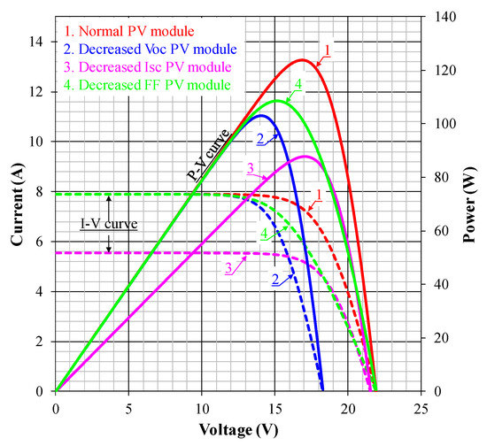 For simulation, four different PV module conditions which represent most of the PV system’s operation is defined. The first condition is normal while the rest are faulty conditions, namely decreased Voc, decreased Isc, and decreased fill factor (FF). The parameter setup for normal PV module is shown in Figure 2b, where the light-intensity input S is 1000 W/m2, and the ambient-temperature input Ta is 25 °C. The decreased Voc model is obtained by reducing the number of cells in a PV model from 36 to 30. The decreased Isc model is obtained by reducing the light-intensity input, S from 1000 W/m2 to 700 W/m2. The decreased FF condition can be achieved by increasing Rs or decreasing Rsh or varying both values. For simplicity, only Rs is considered where the value varies from 0.008 Ω to 0.016 Ω. The simulation results showing the detailed PV module parameters under normal and faulty conditions are listed in Table 1, and their corresponding P-V and I-V curves are illustrated in Figure 3.