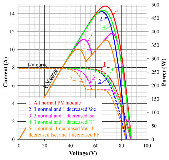 There are several failure modes and degradation mechanisms which reduce the power output or even cause PV modules to fail [1,23]. Electrical fault scenarios in a PV string can be classified as partial shading, line-to-line fault, bypass diode fault, degradation fault, bridging fault as well as open-circuit fault [4]. The faults cause various effects on the PV string electrical characteristics, such as reduced open-circuit voltage (Voc), reduced short circuit current (Isc), and reduced fill factor (FF), which consequently shift the normal operating point of the PV array.