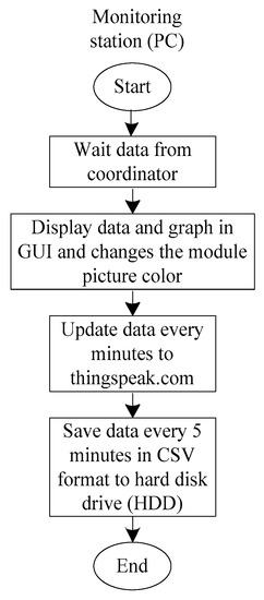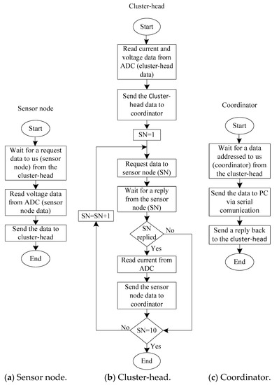 From the end-point, the sensor nodes read the PV module voltage via ADC and send to the cluster-head when requested. Then, the cluster-head reads the PV module current and forward the fetched data to the coordinator. The coordinator receives the data and subsequently sends it to the monitoring station. The programming flowchart of each wireless sensor network component is shown in Figure 6.