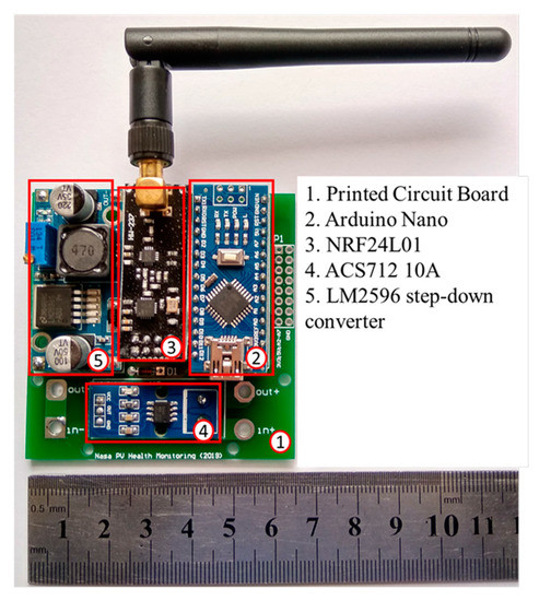 The WSN comprising sensor node, cluster-head, and coordinator is built using four modular circuits namely microcontroller module (Arduino Nano), power module (LM2596 step-down converter), Arduino current sensor module (ACS712 10A), and antenna wireless transceiver module (NRF24L01). A printed circuit board (PCB) for sensor node, cluster-head, and coordinator is designed to accommodate all the modular circuits required for monitoring current and voltage in each PV module. The developed PCB with modular circuits is shown in Figure 10.