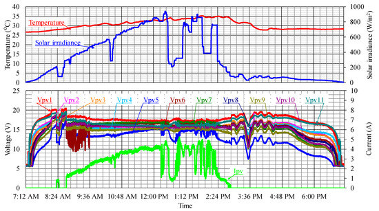 Figure 12 shows the data collected on 23 April 2019 using the developed PV health monitoring system together with the solar irradiance and ambient temperature data. The solar irradiance and ambient temperature collected using the commercial weather monitoring station (Davis Vantage Pro2). The solar irradiance sensor is mounted horizontally with the tilt angle equal to 0°. From 7:12 AM to 7:07 PM the monitoring station received each PV module data from the coordinator.