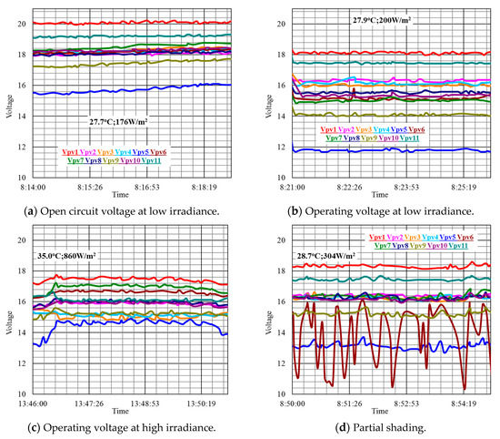 Since the inverter was not operating in the early morning because of low solar irradiance levels, the monitoring station received the open-circuit voltage (Voc) of each module. As the solar irradiance level rose, the PV modules produced a sufficient amount of energy, and therefore, the inverter started operating to feed power to the grid. At this time, the monitoring station began receiving the real-time operating voltage (Vop) of each module. Figure 13 shows the PV module voltage under four different operating conditions with a period of 5 min each. Figure 13a shows the Voc of all modules when the inverter was not in operation, and PV modules received low solar irradiance. Whereas, Figure 13b,c show the Vop of the modules when the inverter was in operation at low and high solar irradiance respectively. Figure 13d shows the Vop of all PV modules with one module operating under partial shading conditions. The detailed data for the four operating conditions are given in Table 3. The average Vop was calculated every one minute for analysis. From Table 3, it is found that PV1 has the highest average Vop and Voc, whereas PV5 has the lowest average Vop and Voc except for partial shading conditions at 8:55 AM. In this case, the shaded module PV6 has the lowest average Vop at 11.97 V. From Figure 13, the Vop of PV6 is generally higher than PV5 in most of the time without partial shading.
