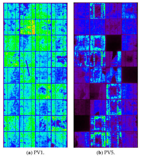 In order to verify the diagnosis, PV1 and PV5 have been selected as the samples for verification with the electroluminescence (EL) imaging method. EL imaging was taken using the Greateyes LumiSolarProfessional BL system at room temperature. The system applies a constant current to the PV module while the CCD camera captures the EL image. The EL imaging results are shown in Figure 14. Minor cracks have been found in both PV modules, but the number of cracks and the degraded dark regions are larger for PV5 as compared to PV1 module.