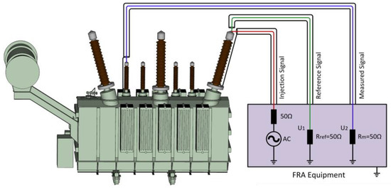 In FRA, transfer functions (TFs) of transformers are measured. TFs are determined by the electrical parameters of power transformers, such as capacitance and inductance of windings, capacitance between windings, capacitance between windings and ground, etc. This diagnostic method is based on the principle that the geometrical changes in the transformer core and windings due to mechanical stresses can be considered as a change in the RLC parameters of the equivalent circuit of the power transformer. Therefore, these changes can be detected through a change in the TF of the transformer. The measurement is performed over a wide range of frequency (few Hz to several MHz), and the results are compared with a reference measurement “fingerprint” of the winding to perform a diagnosis. The measurement setup for the FRA method is shown in Figure 1. A voltage signal of variable frequency is injected at one terminal, and the response is measured at the other terminal. The response will vary in magnitude and phase. The TF depends on the measurement resistance (50 Ω) and impedance of the transformer Z(ω), as expressed in Equation (1).