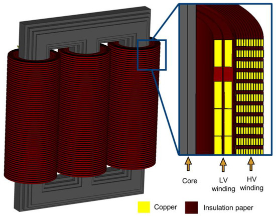 In this paper, a turn-based 3D high-frequency model of a three-phase 3 MVA transformer is developed, which consists of HV and LV windings, including the insulation papers as well as core and surrounding tank, as shown in Figure 4 (tank: hidden). The HV winding is a continuous disk winding with 660 turns in 60 disks, and the LV winding is a helical winding with 24 turns and 12 parallel conductors in each turn. In Appendix A, Table A1 lists the parameters and geometrical details of the transformer. The 3D electromagnetic (EM) simulations were performed in a high-frequency solver of CST MW STUDIO [16]. It solves the discrete Maxwell equations in frequency-domain and calculates the electric and magnetic field distributions at different frequencies; hence, it considers the frequency-dependent effects in the core and volume of the conductors. In order to simulate the behaviour of the ferromagnetic core, frequency-dependent anisotropic complex permeability is considered. The real and imaginary parts of the complex permeability represent the ability of the core material to conduct the magnetic flux and the losses generated in the core due to eddy currents, respectively. As turn-based geometries of the windings are considered, thus, the HF model provides an accurate determination of turn-based parameters, i.e., self-inductance of each turn, mutual inductance between coils, inter-turn, and inter-disc capacitance, etc. The frequency-dependent losses, such as eddy current effects (skin and proximity effect) in the coils and dielectric losses in the insulation structure, are also considered.