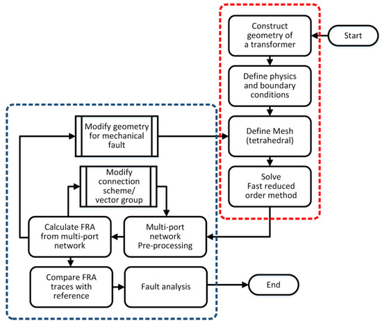 For each 3D EM simulation setup inside CST MW STUDIO, two fundamentally different modules exist, i.e., the design module and the schematic module. In CST, FRA simulation is a three-step process. Figure 5 explains the flowchart of the algorithm for FRA simulation. Firstly, a 3D turn-based geometric model is created in the design module. Secondly, the broadband frequency-domain electromagnetic field computations are performed in the high-frequency solver where the excitation ports are set at both ends of the windings. The model is discretized by applying tetrahedral mesh. The output of this stage is a multiport-network, which characterizes the electromagnetic properties of the 3D geometry model. For a three-phase transformer, a twelve port network model is obtained. Lastly, the multi-port network is applied to the schematic module, where a sinusoidal voltage source is applied analogously to the real FRA measurements to calculate the FRA traces for different connection schemes. In this way, the FRA traces are directly obtained from the 3D high-frequency model of windings without estimating and solving the lumped parameter circuit models.