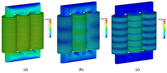 Magnetic field distribution in high-frequency (HF) model of three-phase transformer at different frequencies: (a) 20 Hz; (b) 500 kHz; (c) 1 MHz.