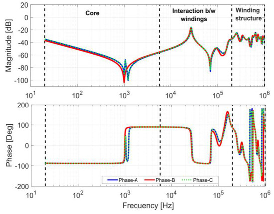 Figure 6 displays the magnetic field strength at different frequencies, i.e., 20 Hz, 500 kHz, 1 MHz. As can be seen, the magnetic field strength decreases with the increase of frequency. At low frequency, flux penetration in the conductor (winding and core) is high. However, as frequency increases, eddy currents are induced in the conductor (winding and core). Consequently, the flux will be confined to the thin layer near the surface, which reduces the magnetic field strength. Note, at 500 kHz and 1 MHz, the flux penetration into the core reduces significantly. Thus, the high-frequency components do not contribute appreciably to the flux in the transformer core, as mentioned in [17]. The Open-circuit frequency response of high voltage winding (HV-OC) of the HF model for open circuit configuration in a healthy state of the windings is shown in Figure 7.