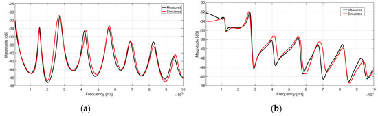 The method is validated with a simple experimental setup, which consists of HV and LV windings. The windings correspond to a medium voltage transformer of 1 MVA. The HV and the LV windings are similar to the three-phase HF model of the transformer, as described in Section 3. In this setup, two hollow copper cylinders are employed outside and inside of the windings to model the tank and the core, respectively. The experimental setup and the corresponding CST MW Studio model are shown in Figure 8. The model was validated with measurements for both healthy and deformed state of windings, as shown in Figure 9 and Figure 10, respectively. These results are based on the author’s previous work in [19,20], with minor improvements. The performance of this method against different mechanical faults was also proven in [19,20]. Thus, detailed validation results are not included in this article; rather, only the results of axial displacement (AD) fault in the IIW connection scheme are presented here. Five steps of AD (each step = 10 mm) are implemented in the HV winding, in both the experimental setup and CST model. The simulation results are compared with measurements, as shown in Figure 10. The results show good principle agreement of the simulations with the measurements, which proves the applicability of the HF model for interpretation of transformer frequency response.