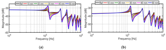 HV-SC (Figure 18b and Figure 19b): For both types of buckling, TFs are changed in the inductive roll-off region. In this region, due to the change of leakage inductance, a change in TFs is observed. The difference in magnitude is 0.5 dB and 0.1 dB for compression and hoop tension failure, respectively. In HFB, both faults result in slight frequency and magnitude shifts.