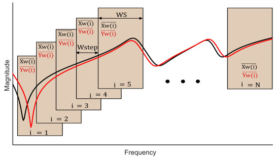 where X and Y are the magnitude vectors of reference and measured TFs, respectively. X(i) and Y(i) are the ith elements of these vectors. and are the means of the ith window. fres is the number of data points per decade, and WS is the window size. In the international standard IEC 60076-18 [9], the minimum measurement frequency resolution is specified, which is 200 points per decade. To take into account the effect of different frequency resolutions, window size is made variable and is calculated from Equation (8). In this way, the effect of different frequency resolutions is also considered. Figure 11 illustrates the basic principle of the presented method. While the representation of the proposed method for identification of the degree of deviation between two TFs of a three-phase transformer is shown in Figure 12. It can be seen that the proposed method has the following advantages: