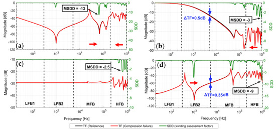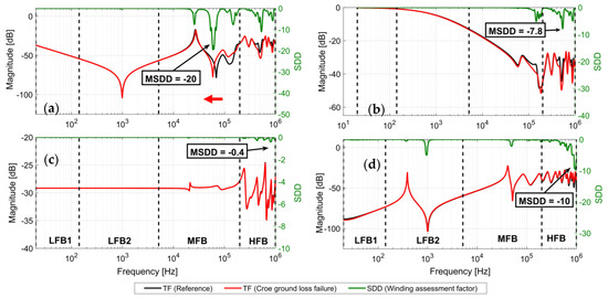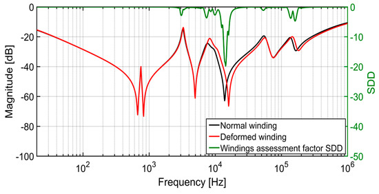 HV-SC: Inductive roll-off region is affected due to the change of leakage inductance. In this region, a decrease in impedance is observed, and the difference in magnitude is greater than 0.2 dB. This region provides the possibility of a quantitative diagnosis of SCTF, and a diagnosis criterion can be set to a permissible change of the impedance. As the low-frequency response (inductive roll-off portion) of the short circuit configuration is equivalent to the short circuit impedance. According to IEC-2200-2014 [21], if the short-circuit impedance of a transformer changes by 2% or more, then the transformer is recognized as damaged. In MFB and HFB, new resonance peaks and valleys can be observed, which are also recognized by the SDD.