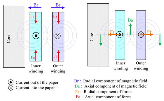Transformer winding faults are typically caused due to mechanical and/or electrical changes inside the transformer. Mechanical changes can arise during the short-circuit events (generating large electromagnetic forces), transportation, installation and/or service life, etc. Among these, the failures due to the generation of electromagnetic forces are most common. The electromagnetic forces are resolved into two components, i.e., radial and axial. The radial (axial) forces are generated by the interaction of short-circuit current and axial (radial) components of the leakage flux density, as shown in Figure 14. These massive electromagnetic forces can displace or deform the windings. The radial forces act inwards on the inner winding producing compression failure, and they act outwards on the outer winding producing hoop tension failure [21]. While the axial forces are generated parallel to the height of the winding, and they act in the opposite direction due to the pattern of the magnetic field. These opposing forces can be of two types, i.e., axial compression forces and axial expansion forces. Axial compression forces directed axially towards the windings centres and can collapse the winding. Axial expansion forces directed axially toward the top and bottom clamping plates and can bend or break them, allowing axial instability [21]. While electrical changes, i.e., shorted-turns, open circuit, can be caused due to ageing and/or subsequent of a mechanical failure.