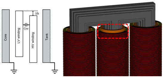 Representation of the axial displacement fault (ADF); schematic (left); B-phase HV winding of 3D HF model (right).