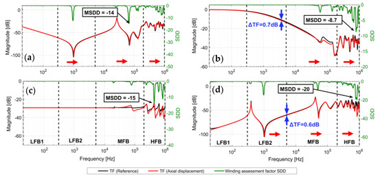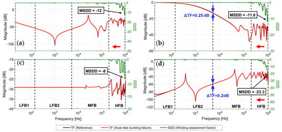TFs of healthy and deformed (hoop tension failure) B-phase HV winding (vector group YNyn0) and SDD as a measure of deviation between TFs; (a) HV-OC, (b) HV-SC, (c) IIW, (d) CIW.