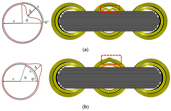 Mainly, two types of radial deformations can be found, i.e., compression failure in inner windings and hoop tension failure in outer windings. Generally, the term “buckling” is used for both types of radial deformations [21]. However, their effects on the FRA spectrum can be different in different cases. In the HF model, both modes of radial deformation are implemented, as shown in Figure 17. For this purpose, one section of the B-phase winding is deformed throughout the winding height. Considering Figure 17, the radius of the radial deformation (r) is modelled as given: