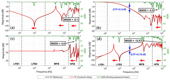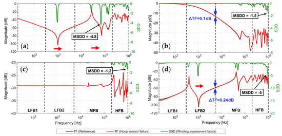 HV-OC: Results do not lead to drastic deviations in LFBs and MFB as the value of SDD approaches to zero in these bands. ADBF only affects the winding structure. Consequently, the effects only appear in HFB where the resonance frequencies are shifted to the left (indicated by the red arrow). These effects are attributed to the changes in the inter-disk capacitance and Mu between the affected disks. The maximum change between TFs in HFB is also indicated by the minimum value of SDD.