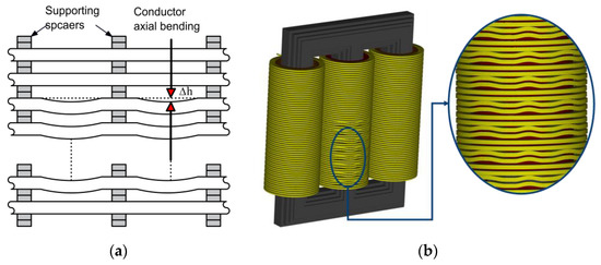 The opposing axial forces on the windings can also bend the conductors between insulating spacers, which are located radially or leaned to each other. The occurrence of this phenomenon is called bending or axial disk buckling. A schematic representation of the ADBF, in a typical transformer winding, is shown in Figure 22a. In the HF model, this fault is simulated by introducing a vertical buckling to the bottom 30 disks in HV winding, as shown in Figure 22b. The buckling distance (h) was set to 4 mm. While the distance (d) between normal disks was 5 mm. The arc angle of the deformed section is kept at 75°. The percentage ADBF level was calculated as follows: