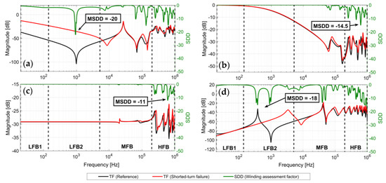 TFs of healthy and turn-to-turn SC failure in B-phase HV winding (vector group YNyn0) and SDD as a measure of deviation between TFs; (a) HV-OC, (b) HV-SC, (c) IIW, (d) CIW.