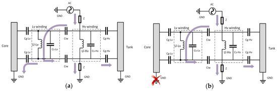 Equivalent circuit of a two-winding transformer; (a) grounded core, (b) core ground loss.