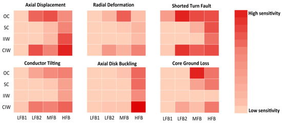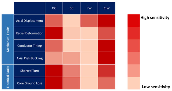 The most sensitive connection scheme against each investigated fault can be identified from Figure 28, which summarizes the MSDD values in different configurations under different investigated faults. It can be noticed that the effect of different faults has differently prevailed in all four connection schemes. It can be seen that OC configuration exhibits the highest sensitivity against radial deformation, shorted turn, and missing core ground faults, while CIW configuration holds the highest sensitivity to detect axial displacement, conductor tilting, axial disk buckling, and shorted turn faults. In summary, OC and CIW connection schemes are proved to be more sensitive under various investigated electrical and mechanical faults. It is noteworthy to mention that derived sensitivity also depends on the definition of the applied indicator (SDD) and may change with the application of different indicators.