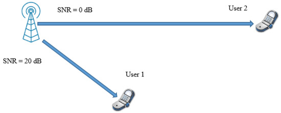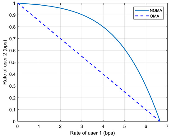 In NOMA, the performance gain compared to OMA increases when the difference in channel gains and the path loss between users is large. For example, in Figure 2, a case of two users with a cell-interior user and a cell-edge user is assumed, where and are set to 20 and 0 dB, respectively. For OMA with equal bandwidth and equal transmission power allocated to each user ( = 0.5, P1 = P2 = 0.5P), the user rates are calculated according to (3) and (4) as R1 = 3.33 bps and R2 = 0.50 bps, respectively. On the other hand, in NOMA, when the power allocation is conducted as P1 = 1/5P and P2 = 4/5P, the user rates are calculated according to (1) and (2) as R1 = 4.39 bps and R2 = 0.74 bps, respectively. The corresponding gains of NOMA over OMA are 32% and 48% for User 1 and User 2, respectively. As shown, NOMA provides a higher sum rate than OMA.