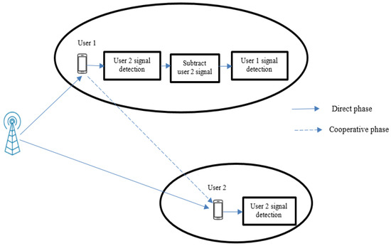 The transmission using cooperative NOMA is divided into two major stages: direct transmission and cooperative transmission. In the direct transmission phase, a broadcast message is broadcasted for both the user with weaker channel conditions (User 2) and the user with stronger channel conditions (User 1).