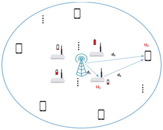 Researchers have illustrated that implementing the relays within wireless networks has a great effect on reducing the fading and shadowing effect on the transmitted signal. Authors in [23] proposed the cooperative NOMA scheme. The idea for this scheme is that users with good channel conditions act as EH relay nodes using SWIPT to support for users with weak channel conditions to strengthen the data transmission. The authors elaborated on the results through a successive detection policy at the side of the receiver, which illustrated that users with better channel conditions should decode messages for the other users. Prior studies done by [24] concentrated on reducing pair-wise error probability (PEP). Authors in [25] proposed a new policy to attain better performance for cooperative NOMA in terms of high coding gains. Authors in [26] considered a Rayleigh fading channel to examine the obtainable average rate via a cooperative NOMA scheme. Ref. [27] presented a new cooperative NOMA model for the purpose of SE improvement. Authors in Ref. [28] placed the users in a random manner while examining the wireless transfer of the power within wireless NOMA networks. In this scheme, users close to the source act as an energy harvesting (EH) using the SWIPT relay to support users that are further away from the source.