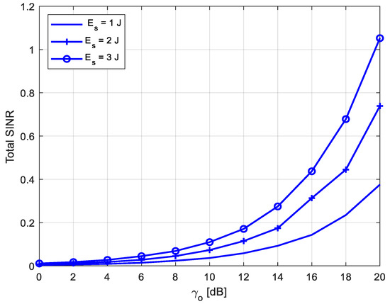 This section illustrates the performance of NOMA networks for two users, one of the users is nearby the BS (known as ‘near user’ or User 1 used interchangeably in this paper) and the other user is far from the BS (‘far user’ or User 2). To illustrate the total SINR at the far user, Figure 6 shows the total SNR with different values of Es. As shown, by increasing the Es, the total SNR is enhanced. This showed that at Es = 1 J, the total SINR is about 0.4, which is greater than the SNR threshold of 0.31 (−5 dB).