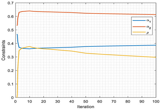 The GA has been used to maximize EE while satisfying SE with different constraints: (i) the power allocation of the near user (), (ii) the power allocation of the far user (), (iii) the power splitting coefficient (. The impact of these parameters on the EE is shown in Figure 8. As shown, after 60 iterations, most of the constraints become constant at a specific value.