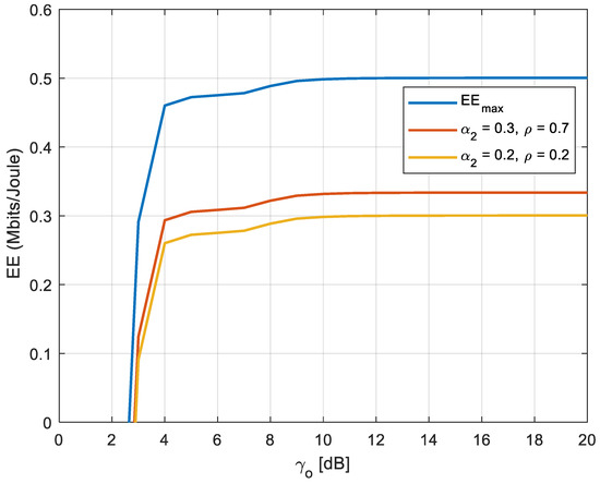 The main aim of the optimization technique is to find the best values of power allocation coefficients and power splitting ratio that gives the maximum EE under an accepted SE called . Assuming the total system bandwidth [31], and without the loss of generality, we set M = N = 2. The minimum data rate can be written as . To compute the maximum EE under accepted SE, should be satisfied. The data rate for the near user is set to and the data rate for the far user is set to . The minimum SE requirement can be stated as: