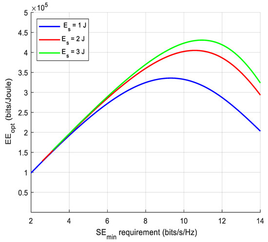 Figure 10 illustrates the SE–EE metric for NOMA systems for different values of Es. If the minimum SE becomes larger than a specific threshold , the EE begins to decrease, because at high SE, the more transmitting power is needed to face the expanding in QoS requirements or by increasing the number of users with poor channel conditions. As shown in Figure 11, at Es = 3 J, the maximum EE occurred at 11 bits/sec/Hz with EE 0.425M bits/Joule, while at Es = 1 J, the maximum EE occurred at 9 bits/sec/Hz with EE 0.325 M bits/Joule. The SE–EE results match with different recent research works, such as published in Ref. [33,34].
