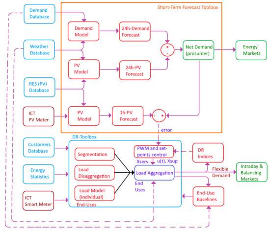 Day-ahead markets represent the most active markets in terms of economic value of transactions, but other markets have experienced a noticeable growth (for example Intraday Markets in France and Belgium with growth rates of 54.5% and 82.9%, respectively, in 2018). Real-Time Markets have facilitated the integration of renewables in USA markets in the last decade, and wider-scale markets with later gate closure would facilitate the integration of renewable in other systems (e.g., Balancing Markets, and specifically, Reserve Replacement). The integration of demand-side resources in markets presents both risks and opportunities for Balance Responsible Parties (BRP, responsible for its imbalances) and Balance Service Providers (BSP, i.e., the provision of bids for balancing) and need the development of new and more integrated methodologies. The main idea of this research work is providing new tools to aggregators for a best management of demand and generation in markets, both in the short-term (around 24 h) and in the very short-term (from several minutes to 1 h), to evaluate net demand unbalance, while the aggregator or other parties take into account gate closure times. To perform this task, the proposed methodology takes profit from different databases which should be able for DR (demand, customer, RES, and weather). From these databases, this work applies different methodologies to obtain well fitted 24 h forecasts for demand and PV generation, and with these predictions aggregators evaluate bids and offers to be sent to Intra-Day or Real Time Energy Markets (with the objective of minimizing the energy costs for customers or prosumers). Logically, both models (demand and PV) exhibits errors and these errors can involve penalties in the markets because other agents (BSP, LSE) should change their energy balance and buy or sell energy in the very short term. Considering that PV-forecasts usually have a greater error than demand-forecast, and that a fast model is needed to manage the potential flexibility of demand in the aggregator-side, a simple and very short-term PV forecast model is developed based on historical recordings of PV generation (in the site) and available real-time measurements (Information and Communication Technology, i.e., ICT devices). This model and the results of cassation processes in short-term energy markets provide a reference signal for flexible resources (only DR resources are considered in this paper). With the help of different tools and scripts from a DR-toolbox (e.g., segmentation, classification, disaggregation and modeling), the aggregator can evaluate the “demand baseline” for different end-uses in the short-term and can propose a control signal to change demand according to its requirements. This demand is simulated and evaluated hour by hour with several indices of performance (and modified in some cases) to fit the demand packages offered to energy markets (i.e., net demand). In other cases, when the power system tackles for flexibility, the aggregator can provide additional flexibility to energy and ancillary services markets, agents or Transmission Operators.