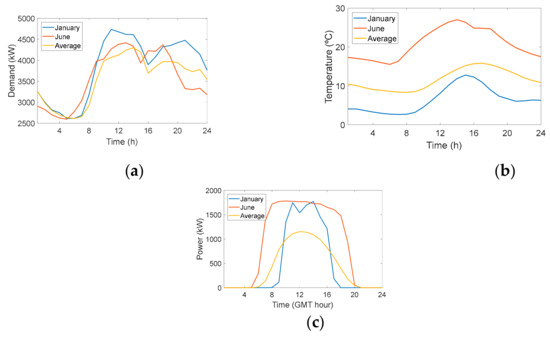 Figure 2a shows the winter and summer loads for two selected workdays monitored at the distribution level (substation) that supplies power at 13.2 kV to the distribution transformer centers (CT) of customers (basically residential and commercial supply). Figure 2b shows the average temperature in the area for the same two selected workdays. Figure 2c plots the hourly PV power generation on the peak production days (days with the highest energy generation) of January and June 2010. The PV power generation values in the central hours of the day can mean an important fraction of the town consumption (30–40%). The selection of January and June as representative months is due to the fact that June corresponds to the month with the highest PV generation, while January corresponds to the lowest PV generation and the highest energy consumption. In Figure 2, it is also shown the average profiles of demand, temperature and PV generation for the period in which data is available (from 1 October 2008 to 31 March 2011). It is remarkable that the average PV generation profile (Figure 2c) is lower compared to the other ones (June and January). This fact can be explained because months’ profiles are representing the peak power days, while the average profile includes days in which there are no PV generation due to adverse weather conditions.