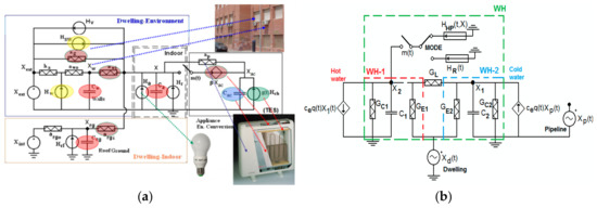 The main features of these models are: they consider heat gains and losses, for instance solar radiation (Hsw, Hw) or internal gains due to inhabitants (Hr) or appliances (Ha) (Figure 4a); the model takes into account heat storage from the specific heat of external walls (Cw), indoor masses (Ca, C1 and C2, especially important for WH) or roof/ground (Crg); and it considers the control mechanisms which drive appliances (for instance thermostats m(t) and DR policies u(t)). Moreover, their state variables are temperatures: indoor (Xi), walls (Xw), roof/ground (Xrg) for HVAC loads (Figure 4a), and X1, X2 for the stratification of water in the reservoir (“hot” WH1 and “cold” WH2 sub-tanks, Figure 4b), that is to say, characteristics that allow the evaluation of energy flows and storage capabilities (i.e., the indirect capacity of storage in the envelope of buildings), the direct storage in WH or the loss of customer service due to the application of DR (i.e., internal or hot water temperature).