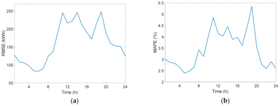 Goodness-of-fit measures by hour of the day in the test dataset: (a) using RMSE; (b) using MAPE.