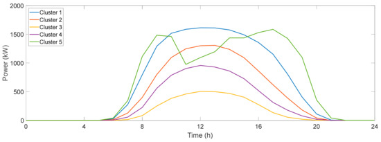 - Secondly, the predicted daily PV generation of the training dataset is grouped into homogeneous clusters according to their shape. Next, a representative PV curve is obtained for each cluster, and a discriminant analysis is developed to assign each predicted PV curve of the test dataset to a cluster.