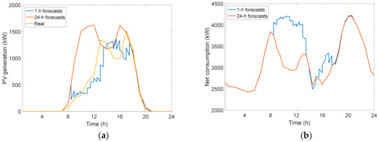 In the case of forecasting hourly PV generation, several machine learning methods were applied and compared, searching for the most accurate. Specifically, linear regression, neural networks, random forest, gradient boosting, and support vector regression models were developed and tuned choosing the optimal values for their parameters by means of genetic algorithms. Unlike hourly load forecasting, the goodness-of-fit measures of the predicted PV curves showed lower accuracy. Regarding the clustering method applied to the PV curves, the dynamic time warping distance [30] and average linkage were selected for the classification stage.