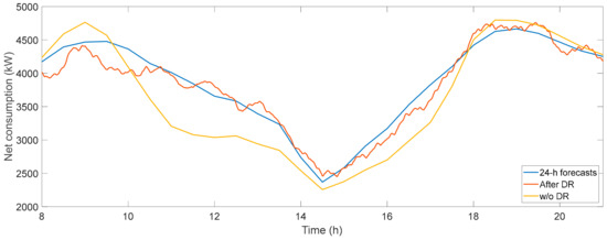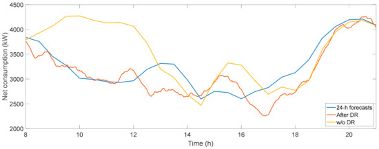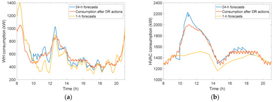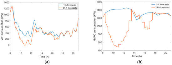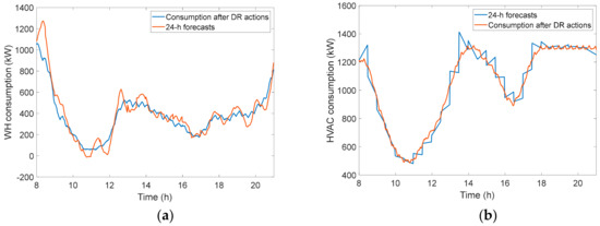 Basically, Equation (2) means that load control is done by a double control. In the case of heating (electric heaters or HP) if the load must go up, the thermostat goes up until it reaches the maximum allowable value (Xlim). Otherwise, if demand must fall to balance a decrease in PV generation (with respect to 24 h forecast), the thermostat or the supply is controlled to reduce demand. Notice that a “baseline”, (i.e., load demand evaluated without control m(t, t + k)) is also needed as reference for controlled load. This baseline also comes from PBLM models (Figure 1).