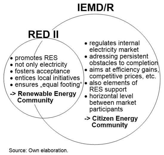 - Apart from concerns that the new European regulatory framework does not sufficiently encourage, or in places even inadvertently discourages, complementarity between RES [15], the RED II does not adequately answer the question how energy sharing between local partners within RECs and with the possible involvement of professional energy companies can be facilitated.