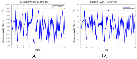 We simulated a case in which the stochastic intensity of the water flow was 0.6. Compared with the results for a stochastic intensity of 0.01, a greater chattering effect is produced by the energy losses from internal disturbances. Although the overall system state variables of the method in [